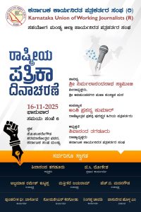 ಬೆಂಗಳೂರು, ನ. 15: ಕರ್ನಾಟಕ ಕಾರ್ಯನಿರತ ಪತ್ರಕರ್ತರ ಸಂಘದ (ಕೆಯುಡಬ್ಲ್ಯೂಜೆ) ವತಿಯಿಂದ ಮಂಡ್ಯ ಜಿಲ್ಲಾ ಕಾರ್ಯನಿರತ ಪತ್ರಕರ್ತರ ಸಂಘದ ವತಿಯಿಂದ ನ.16ರಂದು ಭಾನುವಾರ ಸಂಜೆ 6ಕ್ಕೆ ಮಂಡ್ಯದಲ್ಲಿ ರಾಷ್ಟ್ರೀಯ ಮಾಧ್ಯಮ ದಿನಾಚರಣೆ ಕಾರ್ಯಕ್ರಮವನ್ನು ಏರ್ಪಡಿಸಲಾಗಿದೆ ಎಂದು ಸಂಘದ ಅಧ್ಯಕ್ಷ ಶಿವಾನಂದ ತಗಡೂರು ಅವರು ತಿಳಿಸಿದ್ದಾರೆ.