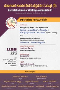 ಬೆಂಗಳೂರು: ಕರ್ನಾಟಕ ಕಾರ್ಯ ನಿರತ ಪತ್ರಕರ್ತ ಸಂಘದಿಂದ ಕೆಯುಡಬ್ಲೂಜೆ ಕ್ಯಾಲೆಂಡರ್ ಬಿಡುಗಡೆ ಮತ್ತು ಅಭಿನಂದನಾ ಕಾರ್ಯಕ್ರಮವನ್ನು 2026 ಜನವರಿ 2 ರಂದು ಶುಕ್ರವಾರ ಬೆಳಿಗ್ಗೆ 11ಕ್ಕೆ ಕೆಯುಡಬ್ಲೂೃಜೆ ಹಮ್ಮಿಕೊಳ್ಳಲಾಗಿದೆ.